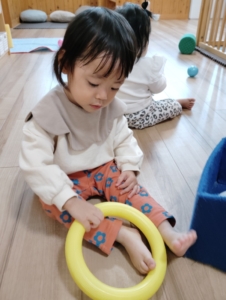 お部屋に丸い輪っかがあるのですが、子どもたちがその輪っかでどのように遊んでいるのか、どのような成長に繋がるのかをお伝えしたいと思います♥️✨️