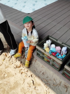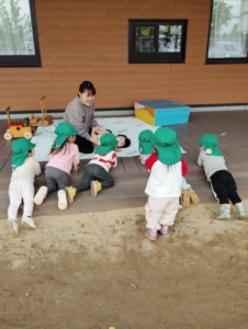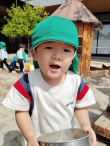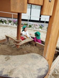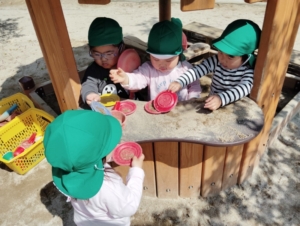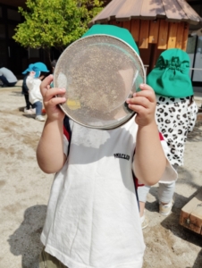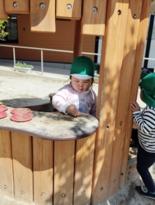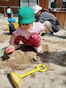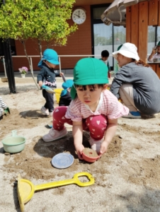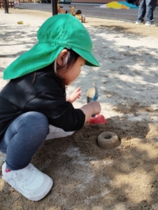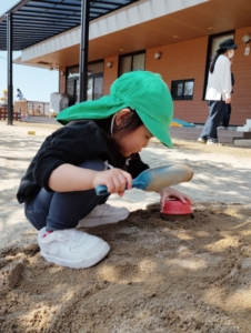 容器に砂を入れて型取りすることがとても上達しています✨️ うまく形にならなかった時には、砂をたくさん入れスコップでギューーーと押す姿も見られます!