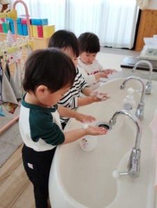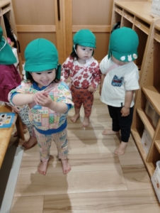 ひよこ組・りす組で衣服の着脱や食事・排泄を丁寧に行ってきたからか、落ち着いており自分でしようとする子どもたち。生活の流れも少し変わった子はいますが、みんな大泣きすることなく。4月とは思えません😳