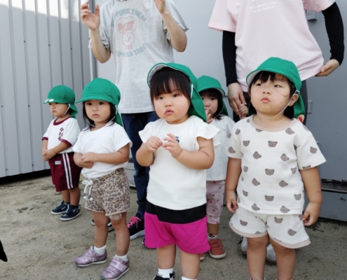 お兄さんお姉さんが先にリレーをしていて、りす組のみんなは何やら不思議そうな表情をして見ていました😳